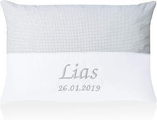 Amilian Kissen 60 x 40 cm mit Namen und Datum, Geschenk zur Geburt, personalisiert, für Baby (Pepita Grau)