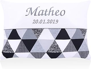 Amilian Kissen 60 x 40 cm mit Namen und Datum, Geschenk zur Geburt, personalisiert, für Baby (Dreiecken Grau)