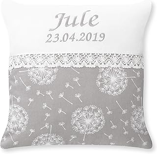 Amilian Kissen 40 x 40 cm mit Namen und Datum, Geschenk zur Geburt, personalisiert, für Baby (Pusteblume Grau)