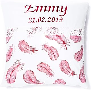 Amilian Kissen 40 x 40 cm mit Namen und Datum bestickt Geschenk zur Geburt Taufe zum Namenstag personalisiert fürs Baby Kinder inkl. Bezug 100% Baumwolle Muster: Daune Rosa