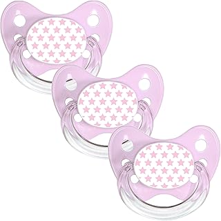 Dentistar® Silikon Schnuller mit Ring leicht greifbar und gut mit Schnullerkette einsetzbar. 3er Set Nuggi Motiv Sterne Rosa Weiß - stars pink white Der zahngerechte, kieferfreundliche Silikonschnuller hat die Gr.1 und ist speziell für Babies, Kleinkinder und Neugeborene von 0-6 Monaten oder bis zum ersten Zahn Für den Babyschnuller wird ausschließlich BPA-freies Material und weiches In enger Zusammenarbeit mit dem Facharzt für Kieferorthopädie Professor Dr. Hinz wurde ein Schnuller mit innovativem und zahnfreundlichem Mundstück entwickelt. Somit ist unser Dentistar der einzige Schnuller mit patentierter Dentalstufe. Sie schlängelt sich zwischen den Zähnen hindurch und reduziert den Druck auf Kiefer und Zähne.