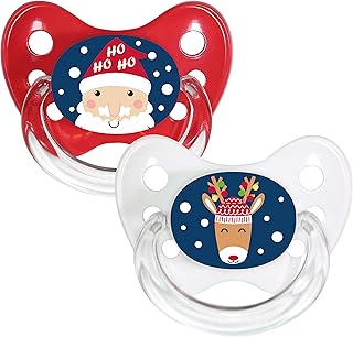 Dentistar® Silikon Schnuller 2er-Set mit Schutzkappe – Größe 2 6-14 Monate – Zahn- & kieferfreundlicher Silikonschnuller mit Dental-Stufe – Rentier & Weihnachtsmann Motiv – BPA-frei – Made in Germany