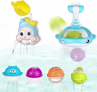 Herefun Badespielzeug Baby, 8 Stück Badespielzeug Set, Wasserspielzeug, Badespielzeug mit Fischernetz, Badewannenspielzeug Schwimmendes, Badewannen Spielzeug Kinder