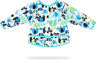 Petit Lulu wasserdicht Baby Lätzchen mit Ärmeln | Größe M | 6-18 Monaten | Bib with sleeves | Ärmellätzchen mit Tasche | Kinderlätzchen mit Druckknopf | Made in EU (Baby Elefanten (blau))